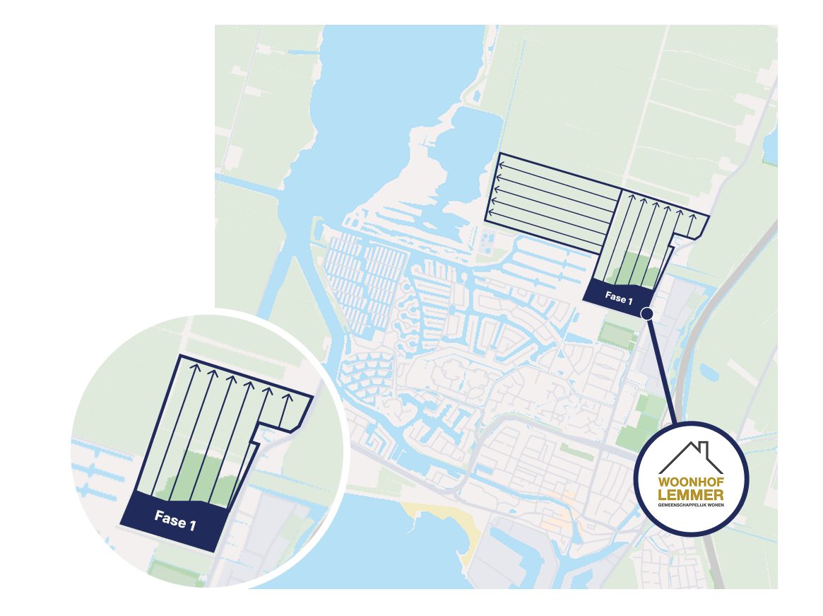Het nieuwe woonplan ligt direct ten noorden van Lemmer, tegen de A6. Een strategische plek: op korte fietsafstand van het centrum, maar met de rust van het buitengebied. Wij willen starten aan de zuidkant (fase 1), met een mogelijke uitbreiding naar het noorden.